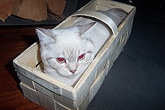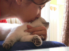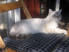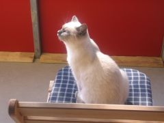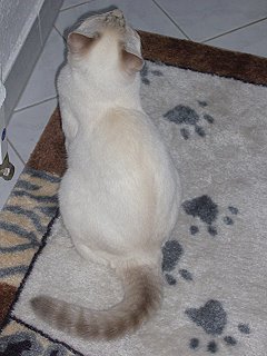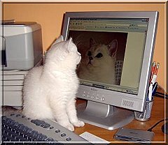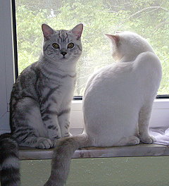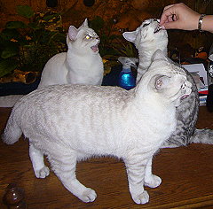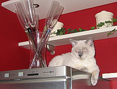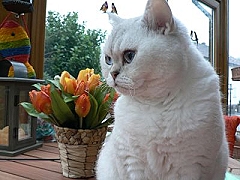 | Calimero, kurz Calli, durfte mit Wolke zu Monika ziehen. | Calli - etwas größer - bewundert Mama Joujou. | Wolke (Selkirk Rex) genießt es zusammen mit Calli bei Monika in Weinheim zu sein. | ||||
