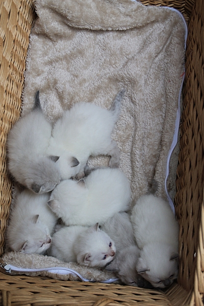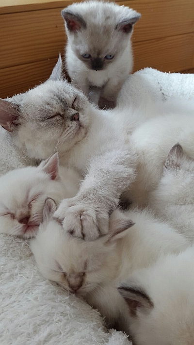 Pepe (unten der zweite rechts und dunkelste) mit dem Q2-Wurf | Pepe, oben Mitte, mit Mama Eule und den Kitten aus dem Q2-Wurf | ||||